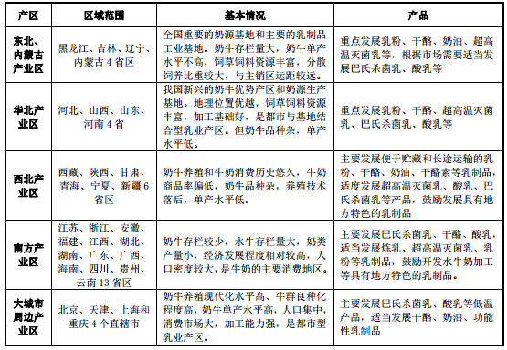 生鲜乳生产的区域性以及低温乳制品严格的物流配送期限、半径限制以及保质期限制,使得乳制品加工业具有一定的区域性特征。我国乳制品工业分为五大区域: