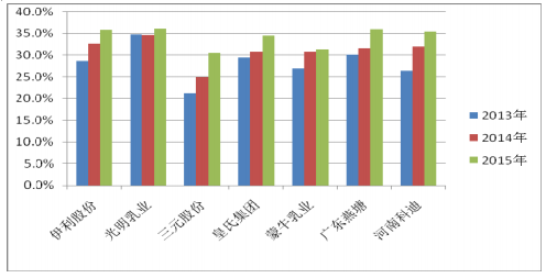 目前乳制品行业利润受原材料、产品价格影响较大。生鲜乳生产成本总的特征是北低南高、农牧区低于大中城市,农户散养低于集中舍养。中国生鲜乳生产总成本中饲料支出比重较大。最近三年,原料奶价格的持续下跌使乳制品企业毛利率保持较高水平并呈增长趋势, 我国乳制品行业上市公司乳制品的毛利率水平如下图: