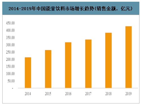 能量饮料在中国市场虽然起步较晚,但增长速度较快。2019年,我国能量饮料市场销售总金额为427.75亿。2014年至2019年能量饮料非现场消费的销售金额复合增速为15.02%,是饮料中增速最快的细分品类之一。