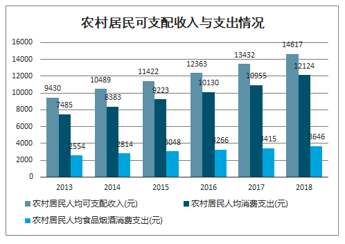 自2013年以来,我国农村居民的人均可支配收入基本以每年9%-11%的速度增长,增速略高于城镇居民,至2018年人均可支配收入达14,617元,而人均消费支出约占收入的80%,其中对食品烟酒的支出约占总支出的30%-35%,随着农村居民消费结构升级,该比例略有下降,但对食品烟酒的支出金额仍呈增长趋势,至2018年人均食品烟酒的支出达3,646元。