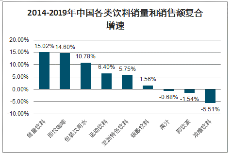 随着我国居民消费水平的提高,消费者对饮料的健康、功能属性需求日益提升,各细分类别饮料中,能量饮料、即饮咖啡、包装饮用水和亚洲特色饮料表现出超越行业的快速增长,其中能量饮料在2014年至2019年期间销售额复合增长率高达15.02%,是增速最快的细分品类之一。
