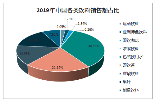 一直以来,中国饮料市场以包装饮用水、即饮茶饮料和碳酸饮料为主,2019年三者占中国饮料销售额的比重分别为34.55%、21.12%、14.93%。经过多年的发展,果汁和能量饮料也已成为饮料行业的重要组成部分,2019年二者占中国饮料销售额的比重分别为15.60%、7.92%。