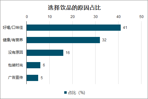 智研咨询发布的《2020-2026年中国饮品行业市场分析预测及投资战略规划分析报告》数据显示:虽然消费者对健康越来越重视,但是依然有 41% 的消费者会因为好喝或者口味更佳选择一款饮品,而 32%的消费者会因为一款饮品健康/有营养而选择它;同时有 6%的年轻人越来越受产品包装和时尚潮流的影响,跟风选择一款饮品,而有 5%的消费者会因为广告宣传吸引,选择一款饮品。最后,竟然有 16%的消费者在选择一款饮品时,没有理由比较随意。