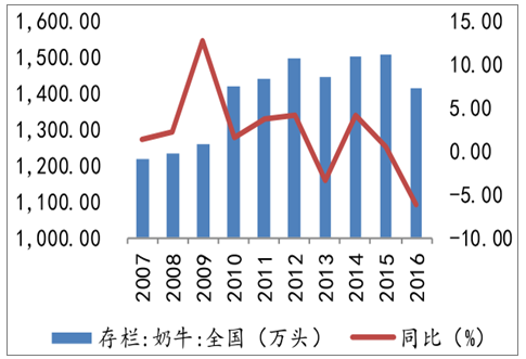 2007年-2016年奶牛存栏量和同比