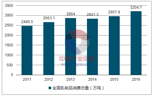 2011-2016年全国乳制品消费总量