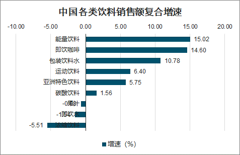 随着我国居民消费水平的提高,消费者对饮料的健康、功能属性需求日益提升,各细分类别饮料中,能量饮料、即饮咖啡、包装饮用水和亚洲特色饮料表现出超越行业的快速增长,其中能量饮料在2014年至2019年期间销售额复合增长率高达15.02%,是增速最快的细分品类之一。