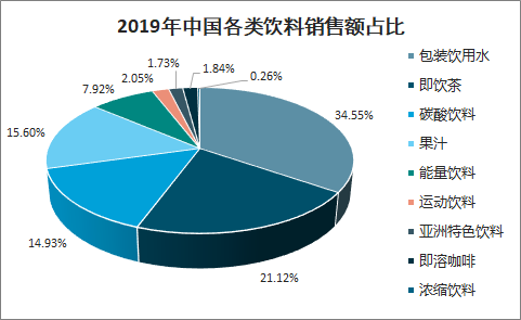 一直以来,中国饮料市场以包装饮用水、即饮茶饮料和碳酸饮料为主,2019年三者占中国饮料销售额的比重分别为34.55%、21.12%、14.93%。经过多年的发展,果汁和能量饮料也已成为饮料行业的重要组成部分,2019年二者占中国饮料销售额的比重分别为15.60%、7.92%。