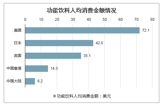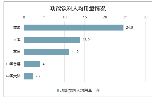 2017年中国大陆功能饮料4人均消费量为2.2升,消费金额为6.2美元,人均消费金额不足中国香港的50%,与英国、日本和美国差距更大,约10%-20%。