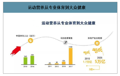 国家推出了《健康中国2030规划纲要》政策后,为中国运动营养市场发展提供了前所未有的发展机遇。从图可知,中国体育人口从2015年的360万到2016年的434万。其中在过去几年的“跑步热”的熏陶下,也出现了大大小小的马拉松赛事。由数据可知2017年,中国各类规模马拉松赛事场次已达到1102场,而2011年注册仅为22场,7年间赛事总量翻了50倍之多,年均复合增长率达到120%。而中国体育产业总规模2015年达到1.7万亿,预计2025年将翻3倍达到5万亿。这是中国体育市场的壮大刺激运动营养行业的发展。