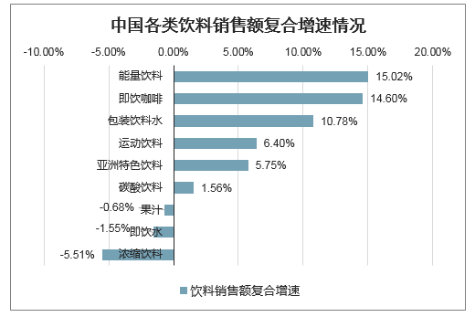 随着我国居民消费水平的提高,消费者对饮料的健康、功能属性需求日益提升,各细分类别饮料中,能量饮料、即饮咖啡、包装饮用水和亚洲特色饮料表现出超越行业的快速增长,其中能量饮料在2014年至2019年期间销售额复合增长率高达15.02%,是增速最快的细分品类之一。