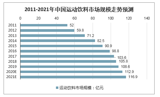 2019年中国运动饮料市场规模将达到108.6亿元,于2021年将涨至116.9亿元,虽市场规模小于能量饮料,但是也持续保持增长趋势。可知,2021年,中国运动饮料的市场规模将至少有116.9亿元,发展极具潜力。