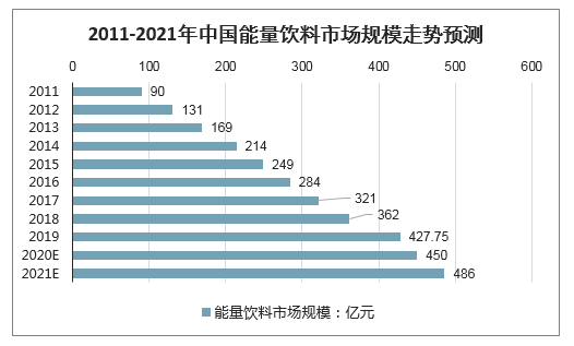 中国能量饮料市场规模从2011年到2018年保持年年增长的趋势,从2011年仅90亿元,到2018年涨至362亿元,2019年能量饮料市场销售总金额为427.75亿。