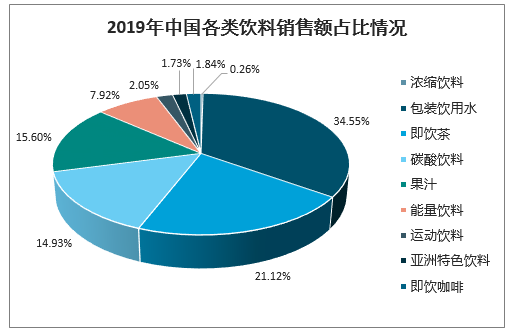 一直以来,中国饮料市场以包装饮用水、即饮茶饮料和碳酸饮料为主,2019年三者占中国饮料销售额的比重分别为34.55%、21.12%、14.93%。经过多年的发展,果汁和能量饮料也已成为饮料行业的重要组成部分,2019年二者占中国饮料销售额的比重分别为15.60%、7.92%。