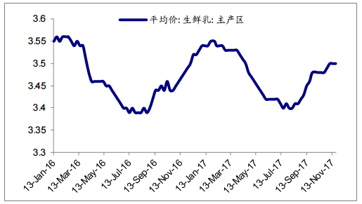 国内原奶价格温和回升。2017年11 月份国内主产区生鲜乳价格平均报价 3.50 元/kg,环比 增长 0.50%,同比增长 0.79%。2017年1-11 月份国内主产区生鲜乳价格平均报价 3.48 元/kg, 同比增长 0.34%。生鲜乳价格自 2017年7 月份探底 3.40 元/kg 后一直保持温和回升势头,预计 趋势可延续至2018年。