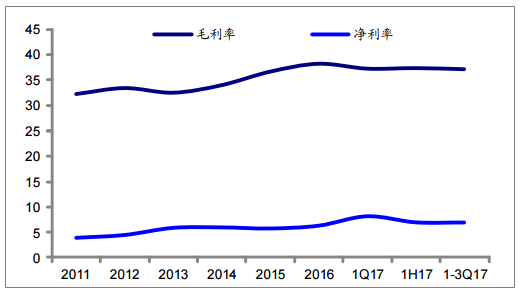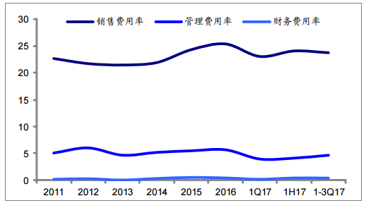 2017年前三季度行业内 8 家上市公司共实现收入 782.67 亿元,同比增长 13.70%,增速同 比增加 13.26pct;实现归母净利润 54.36 亿元,同比增长 12.86%。毛利率为 37.10 %, 同比下降 2.14pct,原辅材料成本压力同比增加。期间费用率为 28.79%,同比下降 3.65pct,其中销售费用率 23.75%,同比下降 2.64pct;管理费用率 4.63%,同比下降 1.12pct;财务费用率 0.41 %,同比增加 0.11pct。