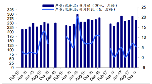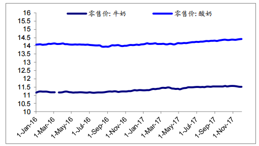 2017年10 月国内乳制品产量 266.40 万吨,同比增长 5.4%,环比下降 7.3%。2017 年 1-10 月国内乳制品累计产量 2496.4 万吨,同比增长 4.1%。2017 年前 三季度乳制品销售量为 2291.2 万吨,同比增长 5.1%。 乳品终端报价稳中有升。2017年11 月乳品终端价格牛奶零售报价 11.52 元/升,环比降低 0.43%,同比增长 2.04%。酸奶零售报价 14.40 元/升,环比上涨 0.21%,同比上升 2.56%。2017 年牛奶零售价稳定在 11.3-11.6 元/升的区间内窄幅波动,酸奶零售价稳定在 14-14.5 元/升的区间轻微震荡。