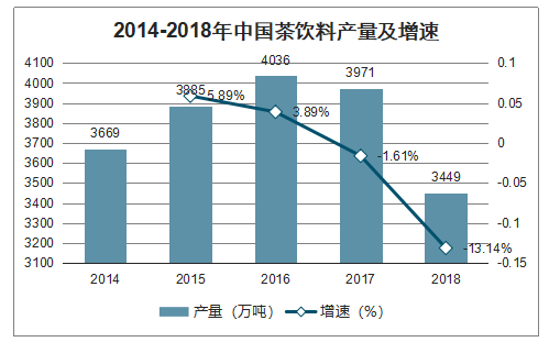 2017年,我国软饮料产品产量达到18051.2万吨,同比下滑1.6%。2018年软饮料累计产量达到15679.2万吨,同比下降13.1%。而即饮茶饮料占软饮料市场份额的22%左右,2018年即饮茶饮料的产量在3400万吨左右。