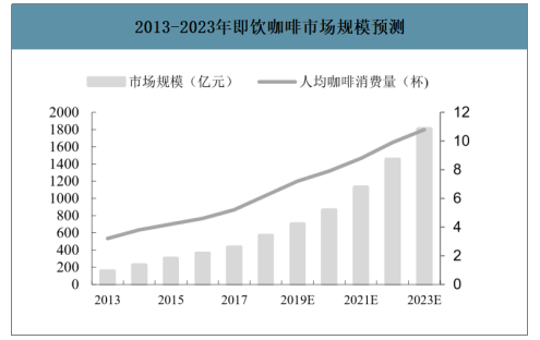 2018年我国咖啡市场规模约569亿元(5年CAGR约为21%),但人均咖啡饮用量仅为0.03千克/人/年,远低于世界平均水平1.25千克,甚至远低于同处东亚市场的日本,目前中国咖啡市场仍以速溶咖啡超70%的市占率占据主导,其次现磨咖啡占比约20%,即饮咖啡仅10%左右。预测即饮咖啡未来每年仍可保持20%的增速,2021年市场份额将超百亿,近年来伊利、蒙牛、农夫山泉等大厂纷纷加码即饮咖啡,共同做大市场。