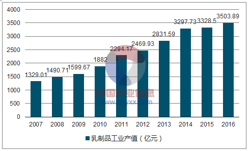 乳制品工业是重要的民生工业,根据报告,乳制品加工属于牧产品加工行业,系国家鼓励类产业。随着国民经济的发展和人民生活水平的提高,越来越多的消费者把乳制品作为日常生活中的一种营养品食用。因此,乳制品行业的工业总产值也不断增加,在国民经济中的比重不断得到提高。工业总产值由 2007 年的 1,329.01 亿元提高到 2016 年的 3,503.89 亿元,年复合增长率为 11.37%。尽管在 2008 年由于三聚氰胺事件的影响,国内乳制品行业出现了一定的波动,但在经历了一段时间的调整之后,全行业仍然保持持续增长的态势。