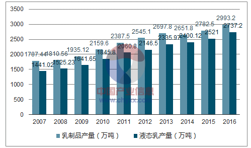 2007年至2016 年,我国乳制品产量呈现稳步增长的趋势,2016 乳制品产量2,993.20万吨,相比2015年的2,782.50万吨,增长7.57%,其中液体乳产量2,737.20万吨,相比 2015 年的 2,521.00 万吨,增长 8.58%。液体乳市场近十年呈现快速增长态势,其占乳制品产量的比例从 2007 年的 80.62%增长到 2016 年的 91.45%,液体乳对整个乳制品行业成长的贡献明显。