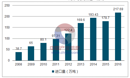 2008 年以来,我国从国外进口的乳制品数量和金额呈上升趋势。2016 年乳制品进口总量为 217.69 万吨,比 2008 年增长 4.63 倍。2016 年进口数量最大的前四种乳制品分别为液态奶、工业乳粉、乳清粉、婴幼儿配方乳粉,分别占30.09%、27.85%、22.84%和 10.17%。进口金额最大的前四种乳制品分别为婴幼儿配方乳粉、工业乳粉、液态奶、乳清粉,分别占 47.17%、23.16%、10.69%和7.08%。