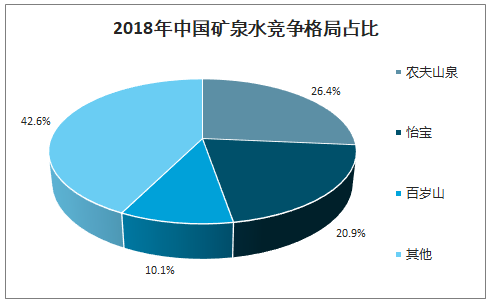 目前,市场上的矿泉水品牌较多,包括国内外各大知名品牌,如法国依云、法国巴黎水、百岁山、怡宝、农夫山泉等。2018年中国矿泉水市场中农夫山泉占有率排名第一,占有率达26.40%;怡宝第二,占有率为20.90%;百岁山位居第三,占有率为10.10%。行业前三市场占有率共达到57.40%,行业集中度较高;且市场占有率前三的品牌均属于国产品牌。