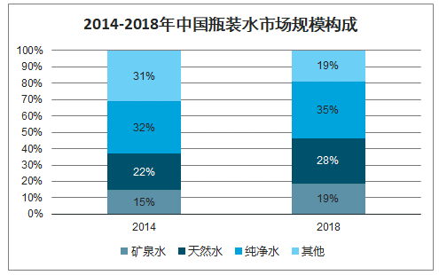 从瓶装水的市场结构来看,矿泉水占瓶装水总体营收比重稳步提升,从2014年的15%提升至2018年的19%,可见随着消费升级,国民饮水需求亦处于升级阶段,矿泉水凭借自身健康属性强和产品差异化策略正在获取更多的市场认可。