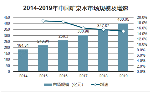 随着矿泉水在市场上被接受的程度逐渐提高,我国矿泉水市场规模逐年增长,2014-2018年行业规模的年均复合增长率达到17.21%。2018年我国矿泉水市场规模达347.87亿元,同比增长15.58%。2019年预计将维持高速增长态势,市场规模将突破400亿元。