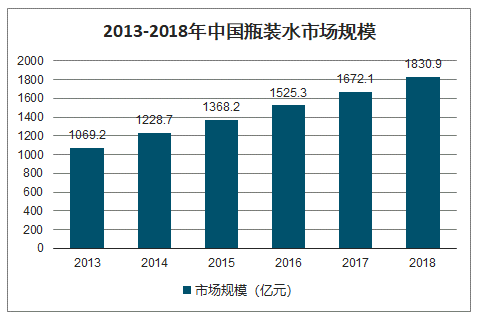 智研咨询发布的《2020-2026年中国矿泉水行业投资潜力分析及投资前景评估报告》数据显示:随着居民人均收入提高带来的消费升级以及接连不断的水污染事故影响,居民对于瓶装水的需求也日益增长。根据调查数据显示,2013-2018年我国瓶装水销售规模逐年增长,由2013年1069.2亿增长至2018年的1830.9亿元,年均复合增长率高达11.8%。