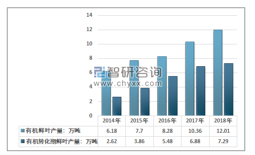 智研咨询发布的《2020-2026年中国有机茶行业发展形势分析及投资战略咨询报告》数据显示,2018年我国有机茶产业种植面积达到11.1万公顷,有机茶叶鲜叶产量达到19.3万吨。其中有机鲜叶产量约为12.01万吨,有机转化期鲜叶产量7.29万吨。