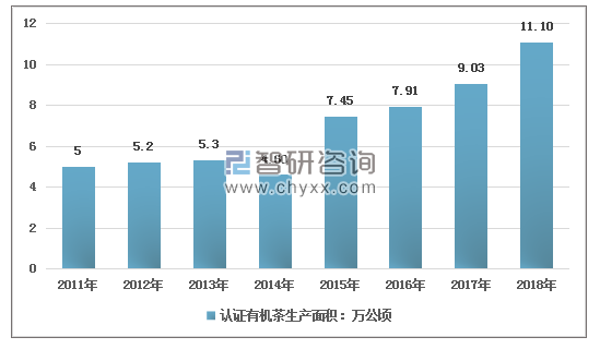 从2006年开始,中国有机茶的生产面积在2万公顷,之后每年都在不断增长,到2011年增长到5万公顷,是2006年有机茶的生产面积的2.5倍。2014年开始,中国有机茶叶生产面积连年增长,2018年达到11.1万公顷。