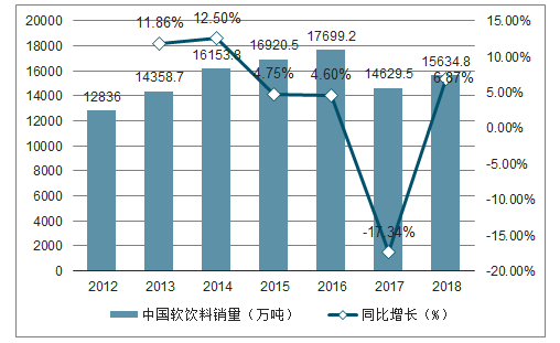 我国软饮料行业进入短暂调整期,但未来前景依旧十分乐观。2017、2018年连续两年产量出现下降,但是销量在2018年却并没有延续下降趋势,企业积压库存得到处理,在一定程度上减轻了企业的生产成本和发展压力,销量继续保持增长也证明了下游市场需求依旧庞大。2018年我国软饮料行业销量为15634.8万吨,较上年同比增长6.87%。