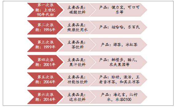 迄今软饮料行业经历了五次浪潮,分别对应碳酸饮料、瓶装饮用水、茶饮料、果汁饮料功能型饮料五大类,每次浪潮后产品品类及规模均迅速提升。可口可乐已经成为现象级的千亿大单品;娃哈哈、农夫山泉均有超百亿级别的单品。近几年异军突起的近水饮料,则以统一海之言为代表,迅速抢占300亿市场空间。