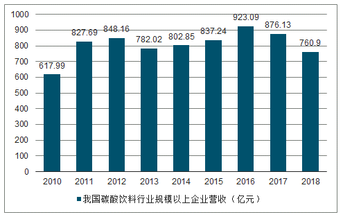 碳酸饮料的起源可以追溯至19世纪80年代,而可口可乐于1927年初次进入中国,仅十几年的时间便使中国成为可口可乐公司最大的海外市场。1948年可口可乐离开中国,而后随着1979年中美恢复建交,可口可乐和百事可乐先后进军中国市场。2017年碳酸饮料行业规模以上企业收入为876.13亿元;2018年营业收入再降至760.90亿元。