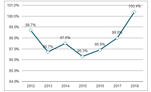 2010-2018年我国碳酸饮料行业规模以上企业营收(亿元)