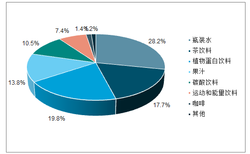 中国饮料市场目前诸侯割据,按照品类的市场份额形成1+5+N的格局:瓶装水市场份额一超多强,植物蛋白饮料、茶饮料、果汁、碳酸饮料以及运动能量饮料均属于大类细分品类,其中瓶装水份额最大,为28.2%,其次是蛋白饮料、茶饮料、果汁和碳酸饮料。咖啡虽然在我国市场增长迅速,但是包装类咖啡饮品占比仍然较小。另外由于软饮料市场产品数量庞杂,原有品类的基础上升级派生出更多品类。