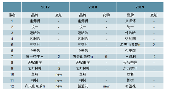 先发优势叠加强大的全国销售渠道迎合强劲的品牌效应的三因子共振助力康师傅及统一两家企业牢牢占据茶饮料行业前两强的位置, 2015 年 CR2 一度达到 81.6%,双寡头格局清晰。然而,近几年来随着我国消费者产品诉求发生改变,大品牌对市场的掌控力有下滑趋势,2018 年 CR2 下滑到 65.1%,较 15 年下滑了 16.5 个百分点,竞争日趋激烈。同时从近几年中国茶饮料品牌力指数排行情况来看,尽管康师傅及统一牢牢占据行业前 2 的位置,但依旧有新品牌涌进榜单。 凭借着主打年轻市场的产品茶π,农夫山泉从 16 年的榜上无名逐步攀升到 19 年的第 5 名,表明市场仍然给后来者留有机会。因此,在大品牌不能充分满足消费者新诉求的大背景下,茶饮料市场的大门依旧为携有潜在爆品的后来者所打开。