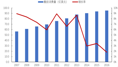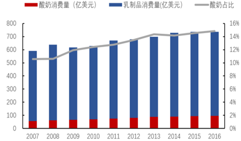 美国酸奶市场广阔,前景稳中有升。2016 年全美酸奶消费量达到 95.2 亿美元,为全球第二大酸奶市场。2007 年至 2013 年间,美国酸奶消费量保持 8%左右的高增长率。
