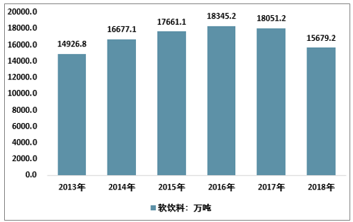 近年来我国软饮料工业发展迅速、种类繁多,但与欧美等发达国家的软饮料工业水平仍有一定的差距,2013年我国软饮料产量为1.49亿吨,2016年增长至1.83亿吨,十三五以来国家对软饮料行业监管逐渐严格,一部分规模较小,不符合生产标准的企业关闭,行业进入短暂调整期,软饮料行业产量下降,2017年产量为1.81亿吨,较2016年减少1.6%,2018年产量为1.57亿吨,同比下降13.14%。