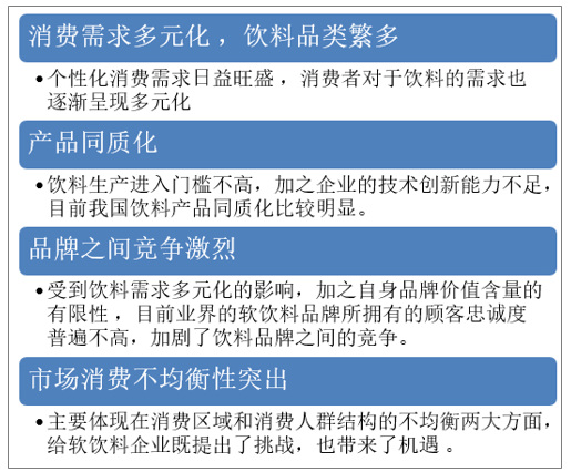 近年来,中国软饮料业发展快速,但市场上产品同质化的现象日益严重 ,产品竞争达到白热化,日益呈现出产品品类繁多、消费需求多元、消费结构不平衡等一系列特点。