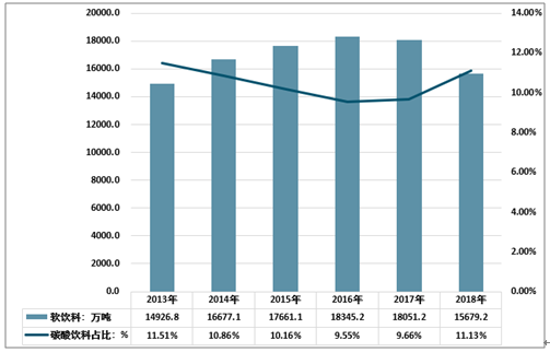 2013-2018年软饮料产量及碳酸饮料产量占比情况