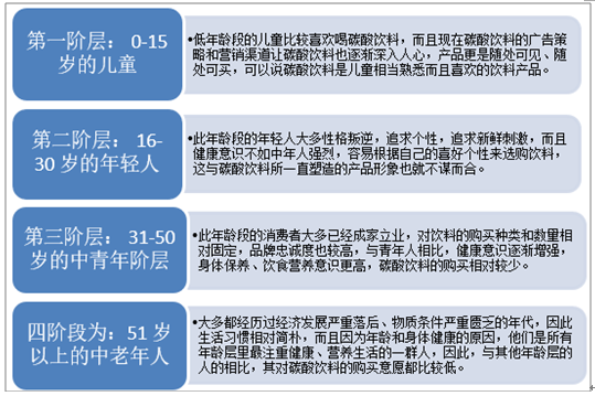 目前碳酸饮料的目标消费群而言,可按不同的年龄阶段分为四个阶层,儿童和青少年是碳酸饮料的主要消费群体之一。
