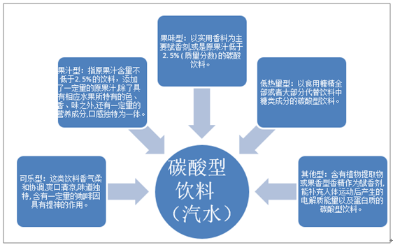 碳酸型饮料是指在一定条件下充入二氧化碳的饮料,不包括生产过程中自身产生二氧化碳的饮料,比如果醋,其主要成分包含碳酸水、柠檬酸等酸性物质、白糖、香料,有些含有咖啡因和果汁、人工色素,还含有少量的电解质等。