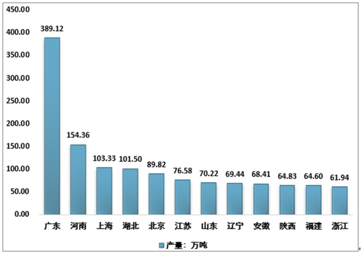 智研咨询发布的《2019-2025年中国碳酸饮料市场全景调查及发展前景预测报告》数据显示:我国碳酸饮料生产集中度较高,主要集中在广东省,知名品牌包括珍珍、健力宝、广氏菠萝啤等,2018年中国碳酸饮料超过百万吨的省份有4个,包括广东、河南、上海和湖北,超过50万吨的省份有12个,其中广东以389.12万吨位居第一,占全部碳酸饮料产量的22.3%,远超其他省份,是排名第二的河南省产量的两倍多,排名前5的省份产量集中度为48.044%。