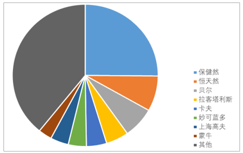 整体来看,我国奶酪行业尚处于快速成长过程中,因此市场格局比较分散,行业 CR5 约 50%。由于国外生产奶酪的历史较长,因此相对而言,目前在国内占据领导位置的主 要还是国外品牌,市占率排名前 5 的品牌有四家都是国外的。排名第一的品牌是百吉 福,是法国保健然公司旗下品牌,目前市占率超过 25%;第二的是安佳,是恒天然旗 下品牌;第三的是乐芝牛,是法国贝勒集团旗下所有;第四的是总统,是拉克塔利斯 其他所有。第五的是妙可蓝多,是前五中唯一的一家国内品牌,是广泽股份旗下品牌。