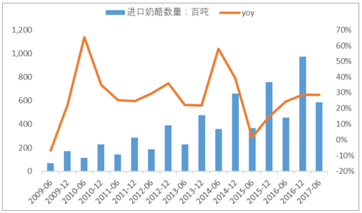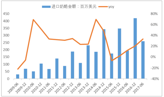 2006-2016 年,国内奶酪消费量 CAGR 约 18%,销售额 CAGR约 27%。其中,2016 年,我国国内奶酪消费量为 6.9 万吨,销售额超过 40 亿元,同 比增长约 14%。2010-2016 年,我国奶酪进口量 CAGR 约 28.14%,进口额 CAGR 约 25.29%;2017 年 1-6 月,我国进口奶酪量为 5.86 万吨,同比增长 28.63%,进口额为 2.59 亿美元,同比增长 33.28%。