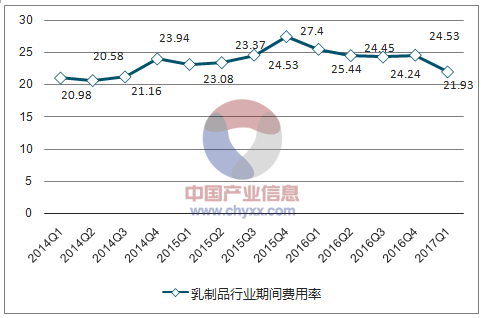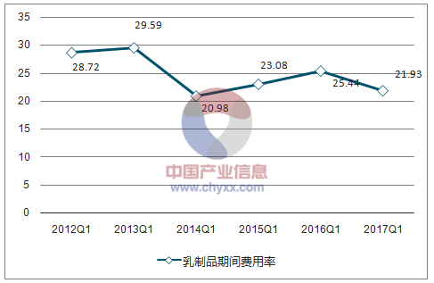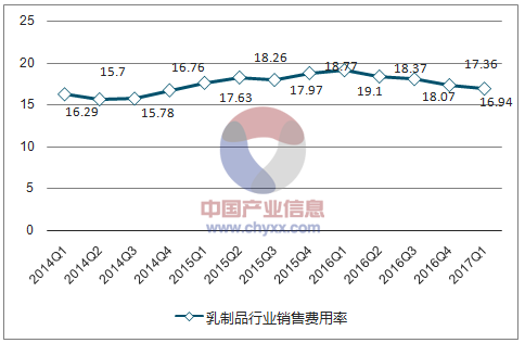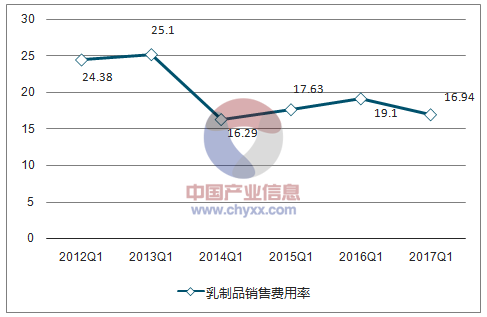 虽然成本的抬升对于乳制品行业的毛利率形成一定压力,但是在毛利率下降的过程中期间费用率也呈现出下降的趋势。2016Q4 和2017Q1 乳制品行业的整体费用率分别为24.53%和21.93%,分别同比下降2.87%和3.51%。其中占期间费用率比重最高的销售费用率分别为17.36%和16.94%,分别同比下降1.41%和2.16%。