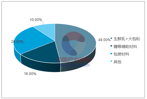 以生鲜乳和大包全脂奶粉为代表的直接材料占总成本的比重接近50%、糖等辅助材料的总成本占比接近16%、包装材料占比为26%,另外运输费用一般记入销售费用率,上市公司整体的运输费用/成本的比重为4.57%。