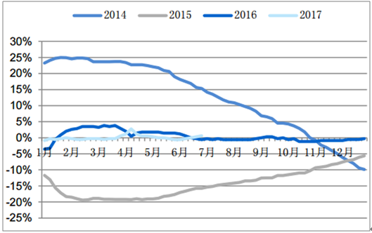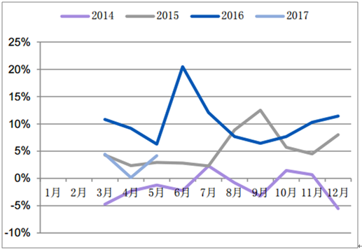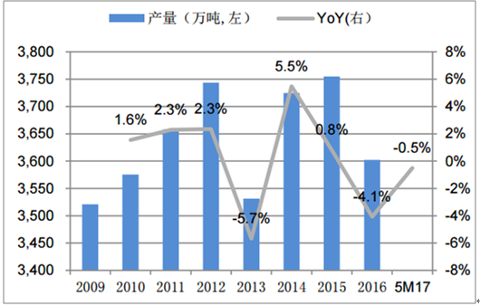 截至 2017 年前五月,乳制品总产量为 1,157 万吨, 同比+2.4%,增速较去年同期 6.1%的水平,下降近 4ppt。