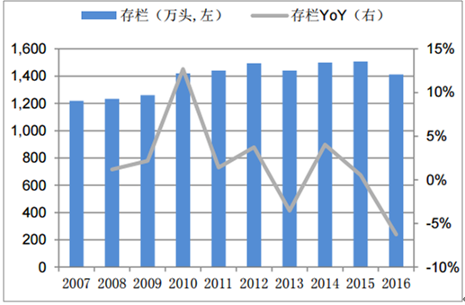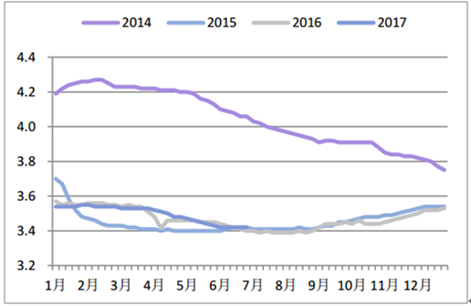 截至 2017 年 6 月第二周,中国主产区生鲜乳收购价 3.42 元/kg,同比-0.3%,今年以来一直保持和去年相仿的价格水平,波动不大。 我们预计随着中国规模牧场占比的逐步提升,未来国内生鲜乳的价格波动幅度 将减小。